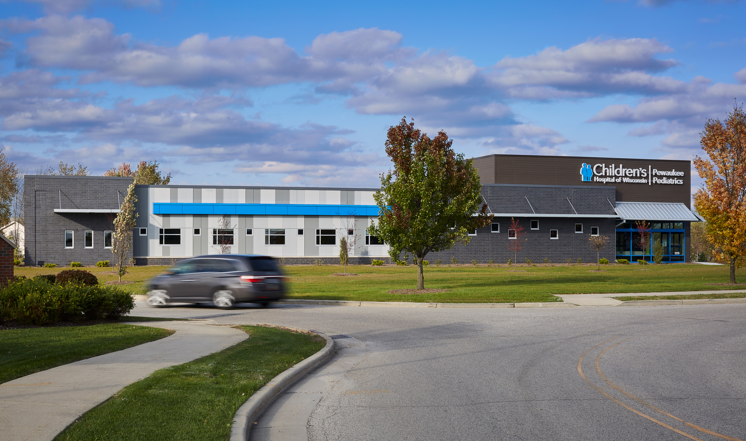 Children's Hospital of Wisconsin Pediatics building with a parking lot and trees in front, under a partly cloudy sky.