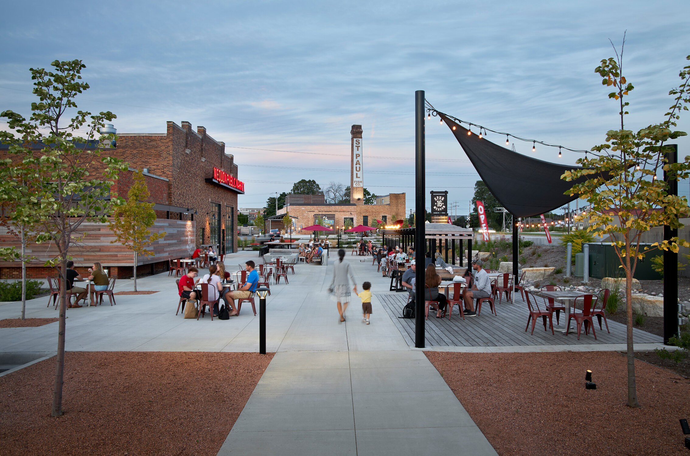 Outdoor dining area with tables, chairs, and some people eating, under a shaded canopy, in front of a brick building and a cityscape at dusk. Mequon Public Market in Mequon, Wisconsin. View fullsize